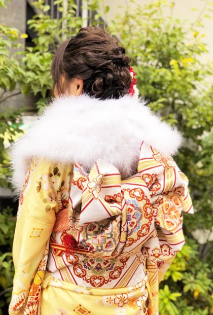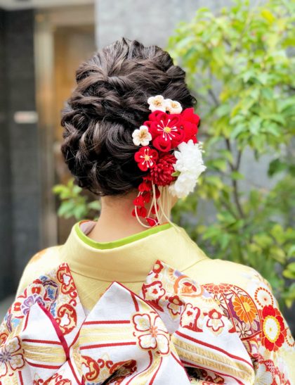 顔のバランスを見ながらルーズにヘアアレンジ。メイクも意見を聞きながらいつもより濃いめで着物に負けないように自然に♪