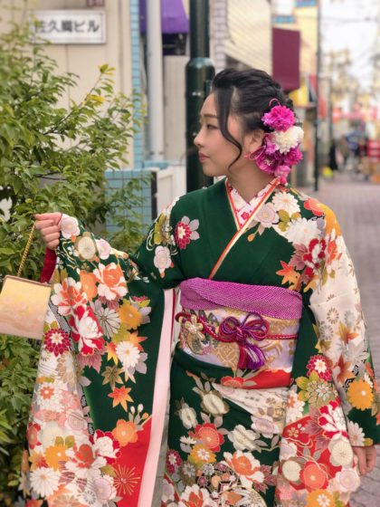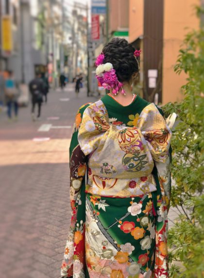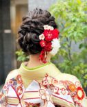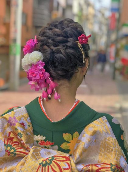 顔のバランスを見ながらルーズにヘアアレンジ。メイクも意見を聞きながらいつもより濃いめで着物に負けないように自然に♪